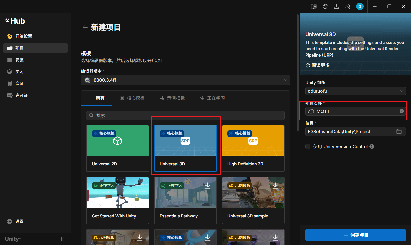 Unity工程类型选择(3D Core)建立一个基本的工程,我这里工程名字叫做MQTT: