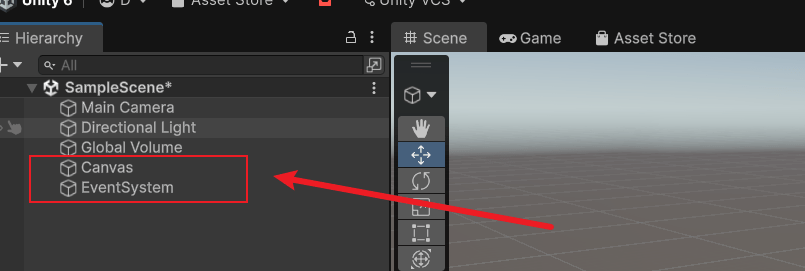 如图,Hierarchy 里可以看到 Canvas 和 EventSystem :