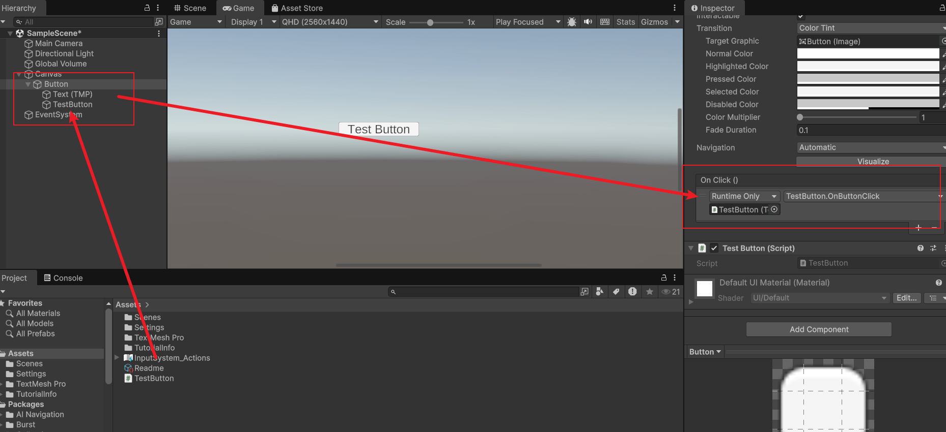 }保存(Ctrl + S),回到 Unity。接下来把脚本拖到 Button 上,在 Button 的 On Click() 里绑定 OnButtonClick: