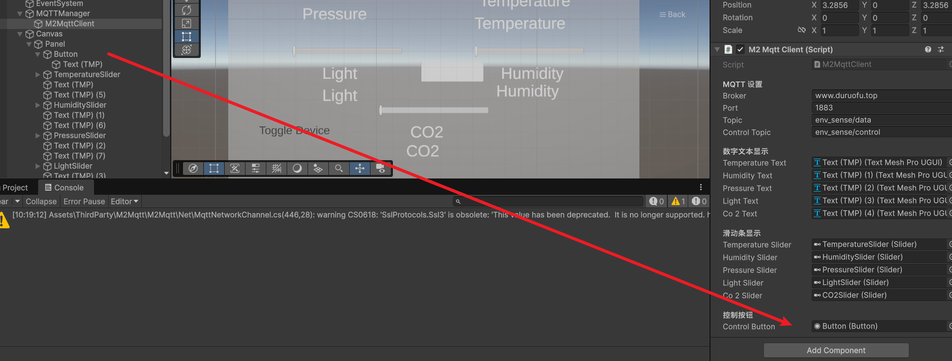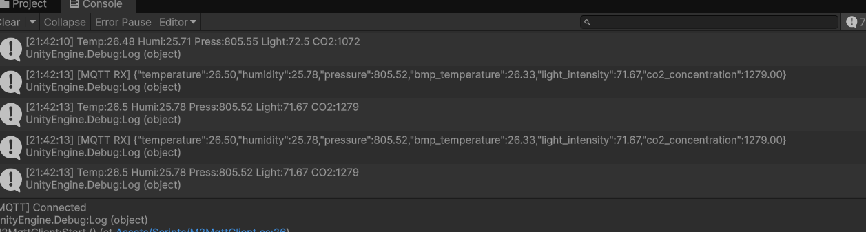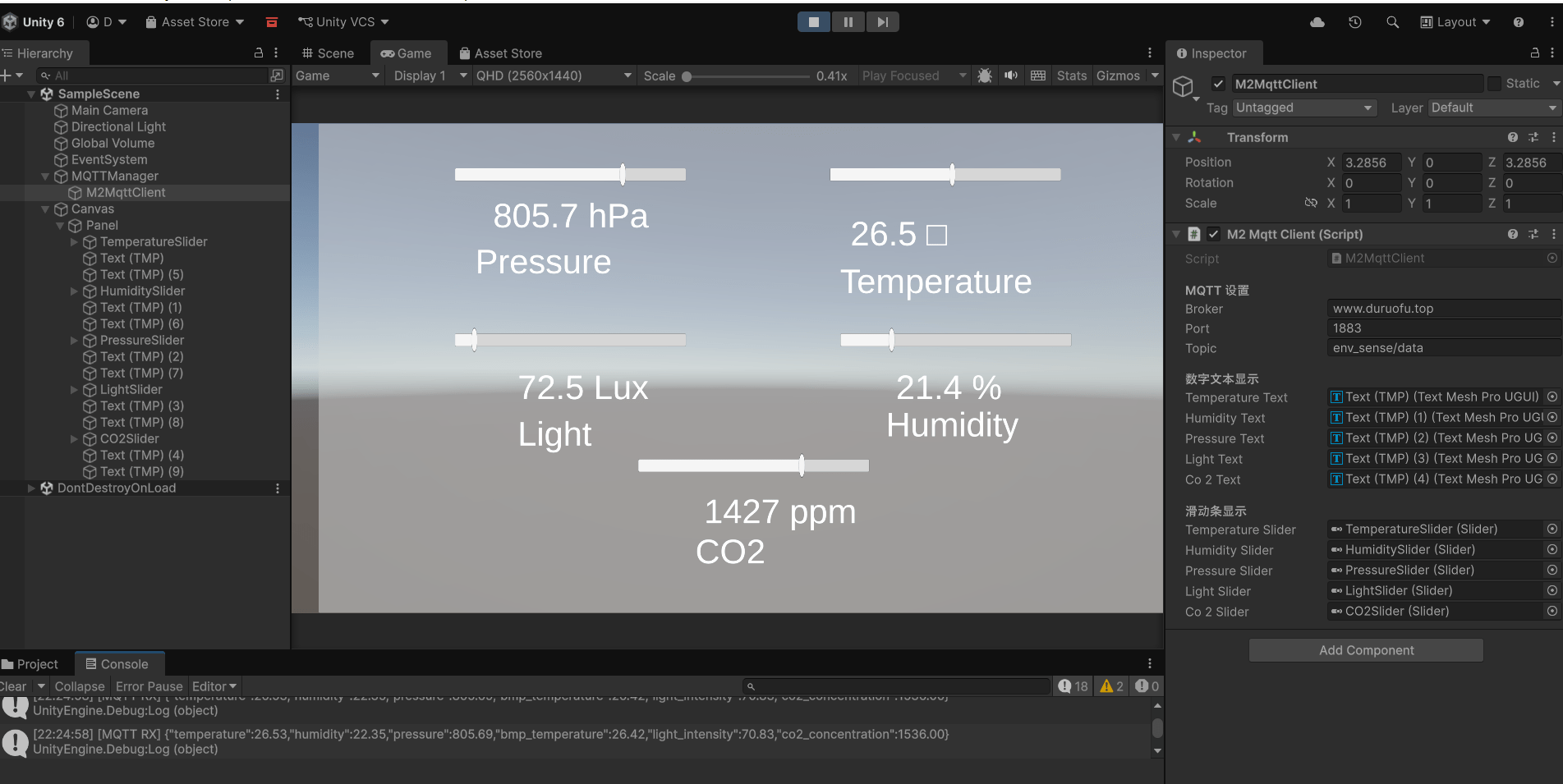 本文记录在 Unity 中通过 MQTT 与真实设备通信 的完整过程。目标是在不涉及游戏开发的前提下,用 Unity 快速实现环境传感器数据的可视化。