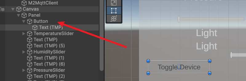 在 DataPanel 下添加一个 Button,给按钮加上 TextMeshPro - Text 显示文字,例如 “Toggle Device”。如下: