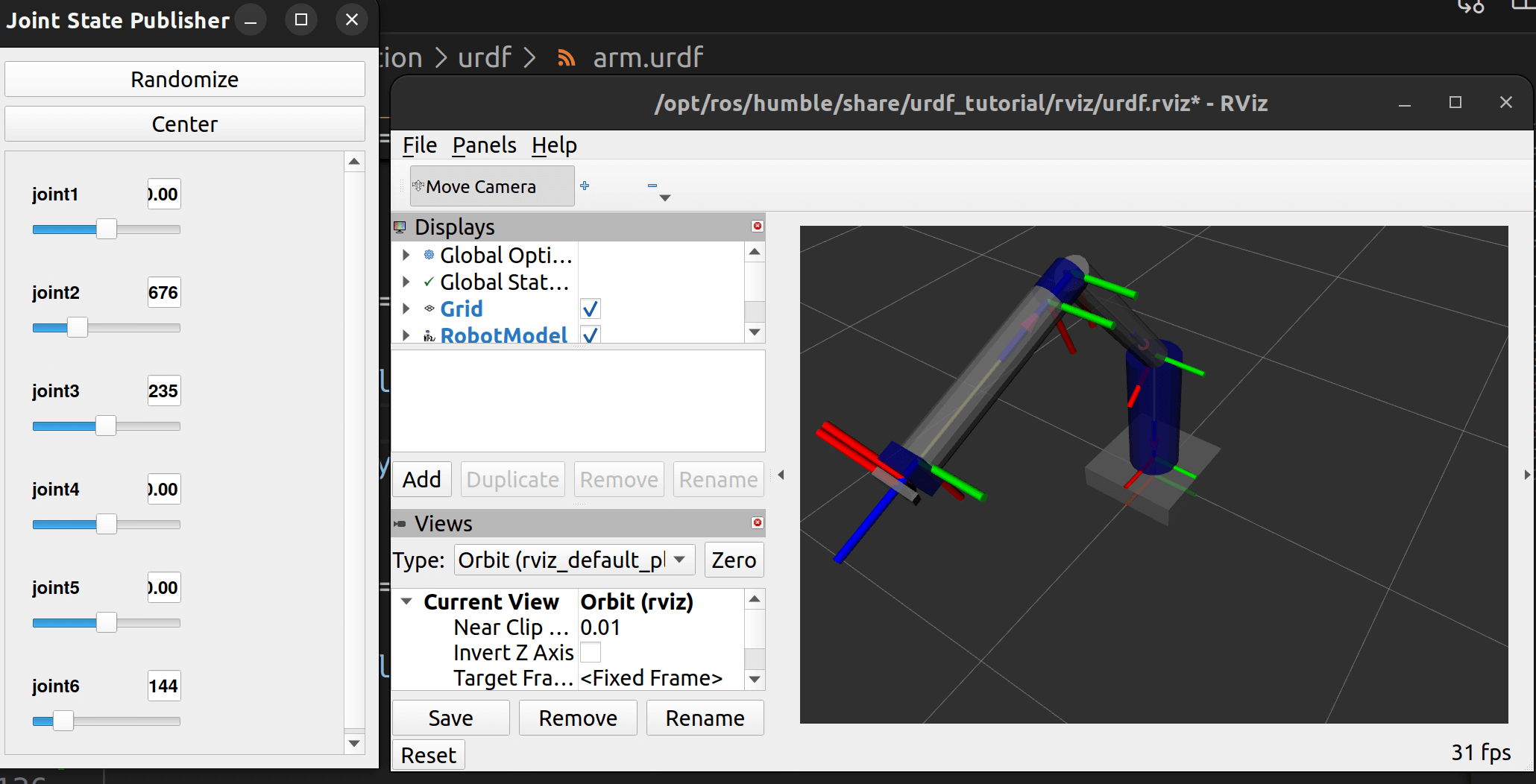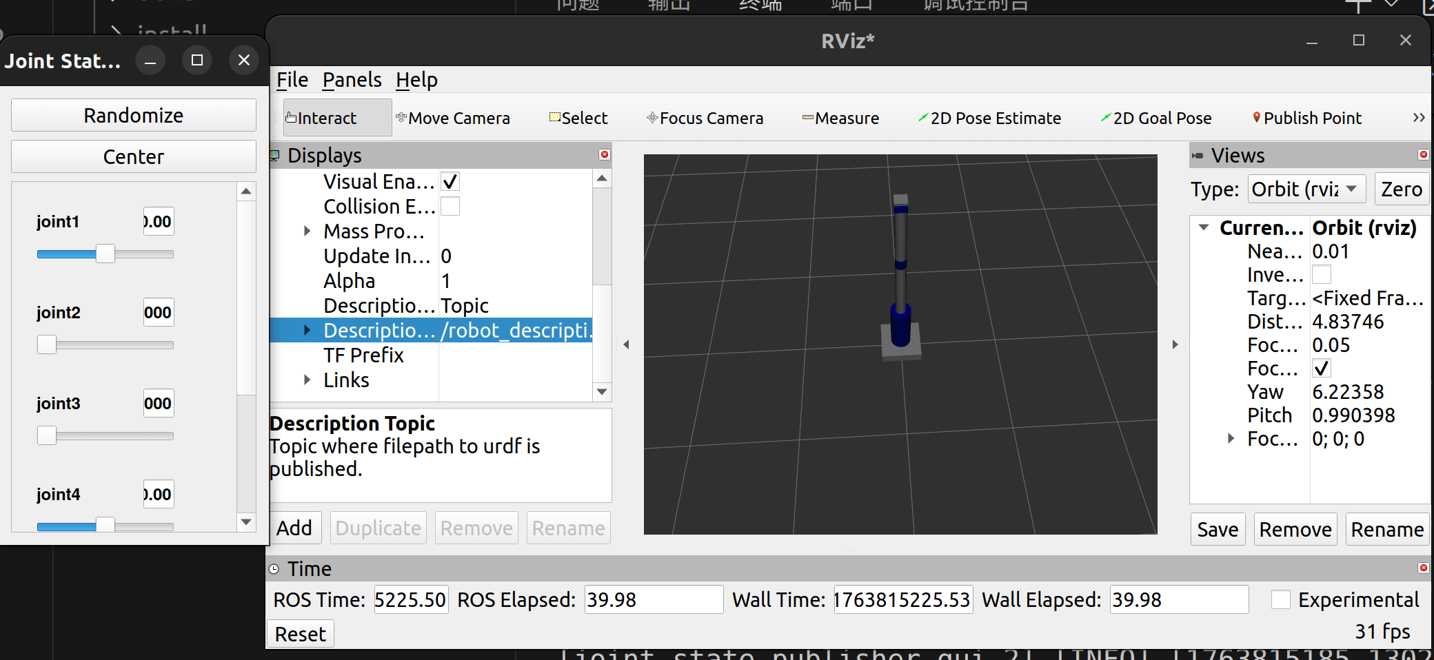 ros2 launch urdf_tutorial display.launch.py model:=/home/duruofu/project/moveit2_learn/ros2_ws/src/robot_description/urdf/arm.urdf这里注意指定自己文件真实的路径。