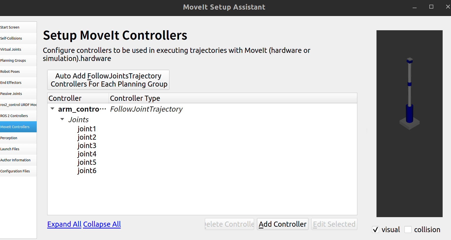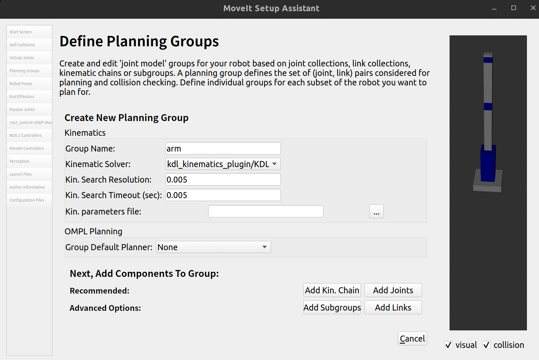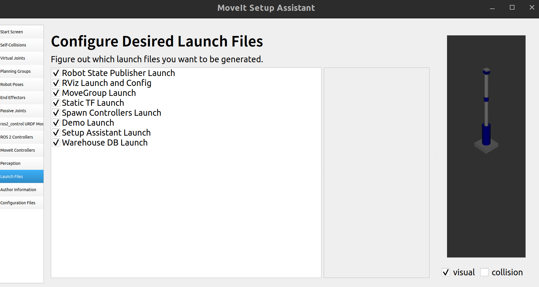 sudo apt install ros-humble-moveit-setup-assistant启动(在工作区目录下启动,否则下一步选择urdf文件会闪退):
